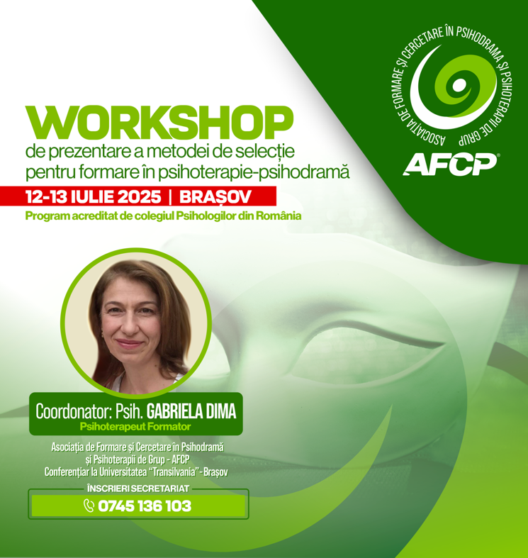 Nitu Andreea și Pavlina Gherlovan, membre ale AFCP susțin un grup continuativ de dezvoltare personală, prin psihodramă, cu frecvență săptămânală, începând cu 12 noiembrie 2025..