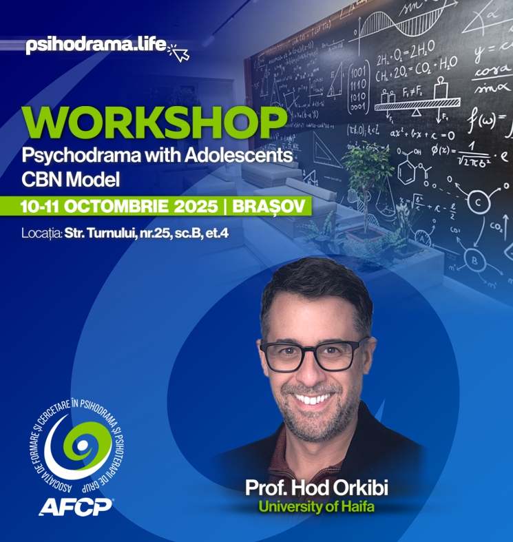 Avem bucuria să vă invităm la un eveniment de excepție organizat de Asociația de Formare și Cercetare în Psihodramă și Psihoterapii de Grup (AFCP), susținut de unul dintre cei mai importanți specialiști internaționali în domeniu, formator al AFCP, acreditat CPR: Prof. Hod Orkibi – doctor în științe, terapeut certificat în psihodramă, profesor la Facultatea de Terapii prin Artele Creative, Universitatea din Haifa, Israel.